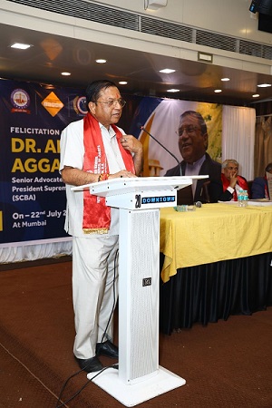 Dr. Adish Aggarwala (Sr. Advocate) was felicitated on 22nd July, 2023 at Mumbai on his being elected as the President of Supreme Court Bar Association by Indian Bar Association, Insolvency and Corporate Professionals Association of India and International Committee of Jurists for Human Rights Protection.  The program was attended by representatives of various Bar Associations, Governing Body members of Western India Regional Council of Chartered Accountants of India, including its chairman Sh. Arpit Kabra, faculties of various law schools including Government Law College, and prominent members of the civil society.